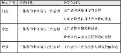 傳統時代和數字化時代,影響工作者成效的三個核心因素,內涵變化見下表: