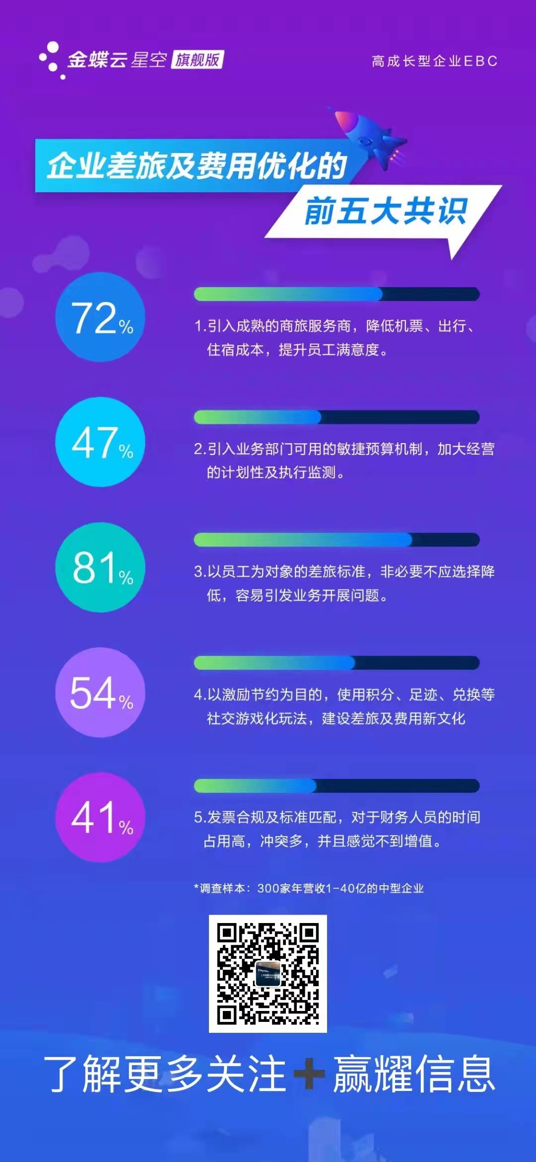 根據一份金蝶面向年營收1-40億中型企業的調查問卷數據顯示(發出問卷375份,收回問卷300份),“關于企業差旅及費用優化的五大共識”,其中提升差旅預算的敏捷管理機制、提升員工差旅服務滿意度、激勵差旅費用節約措施社交化、差旅報銷高效處理等舉措已成為大多企業最認同及關注的問題。
