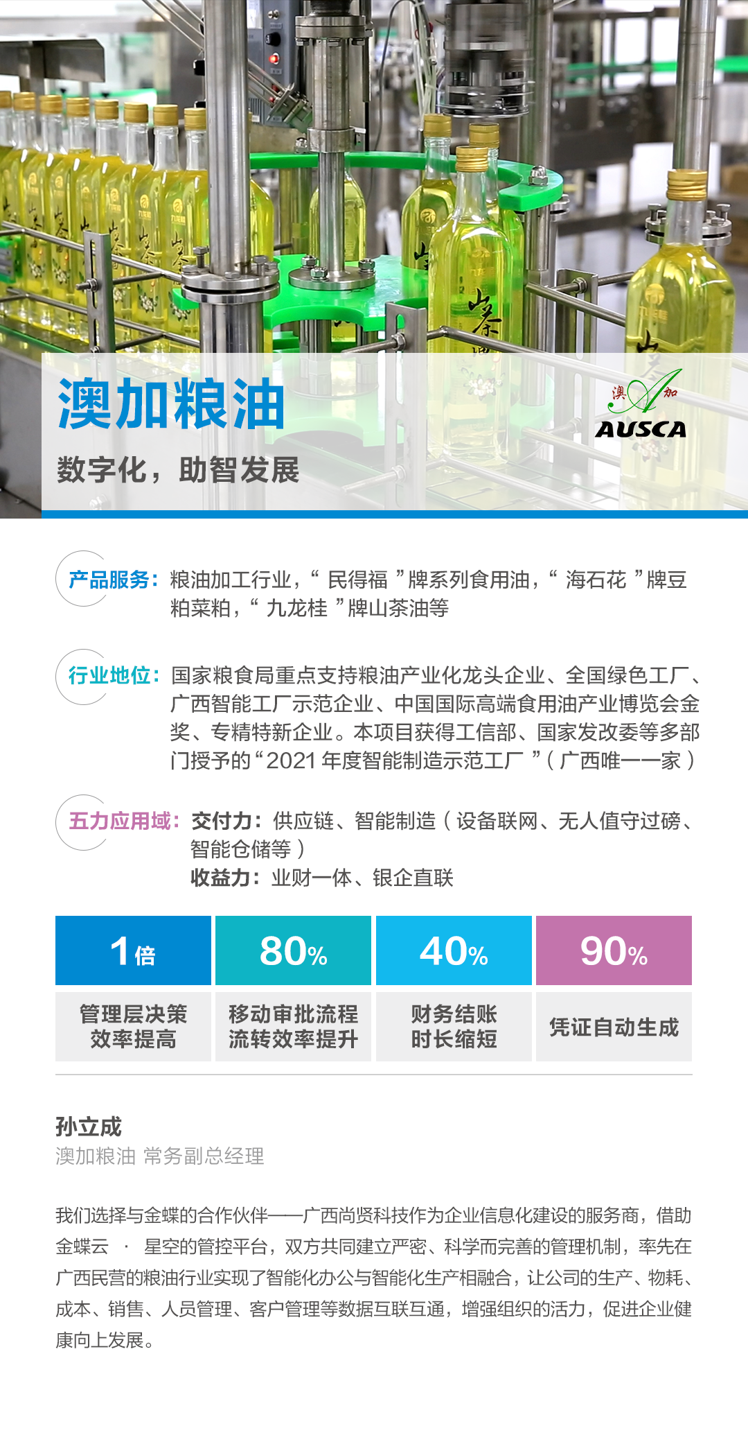 2019年澳加糧油與尚賢科技(廣西金蝶伙伴)正式簽署協議,雙方共同合作打造糧油企業的數字化工廠管理平臺,尚賢科技為澳加糧油實現智能制造提供軟件基礎和信息化技術服務。金蝶云產品的開放性,可迅速解決澳加糧油多種智能設備和系統對接的需求,同時多組織多核算體系、全成本核算、移動應用等,能承載澳加糧油未來的發展規劃需求。雙方共同努力,目前企業已實現: