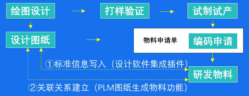 再次就是需要控制管理物料的創建,規范創建信息的輸入。這項管理主要以PLM作為物料創建的源頭和唯一入口,通過在物料申請單輸入信息,利用一體化平臺支持產研協同的跨部門流程來完成。