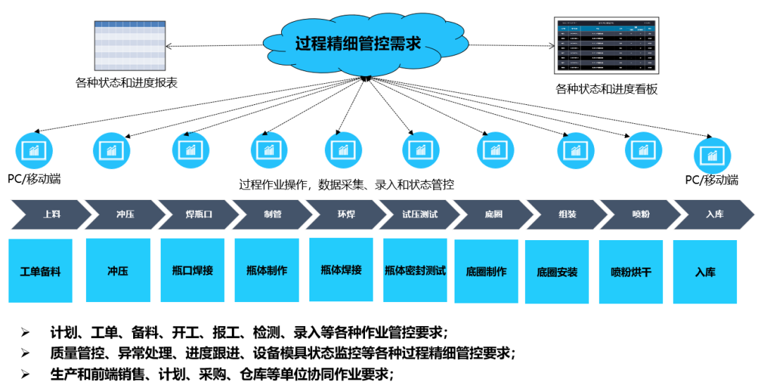 ⑦ 生產過程中,涉及計劃制定與下達、工單開立、備料、開工、報工、檢測等各種實物狀態轉換和信息錄入;中間過程包含檢測、質量管控、異常處理、進度監控、設備模具等狀態管控;生產過程如何與前端銷售、計劃、采購、倉庫管理等單位協同作業,如何狀態信息收集和呈現、精細管控,這是生產過程精細管控需求場景;
